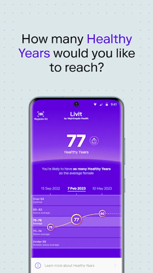 Based on your blood sample, we calculate how many Healthy Years (active years without severe disease) you’re likely to have.