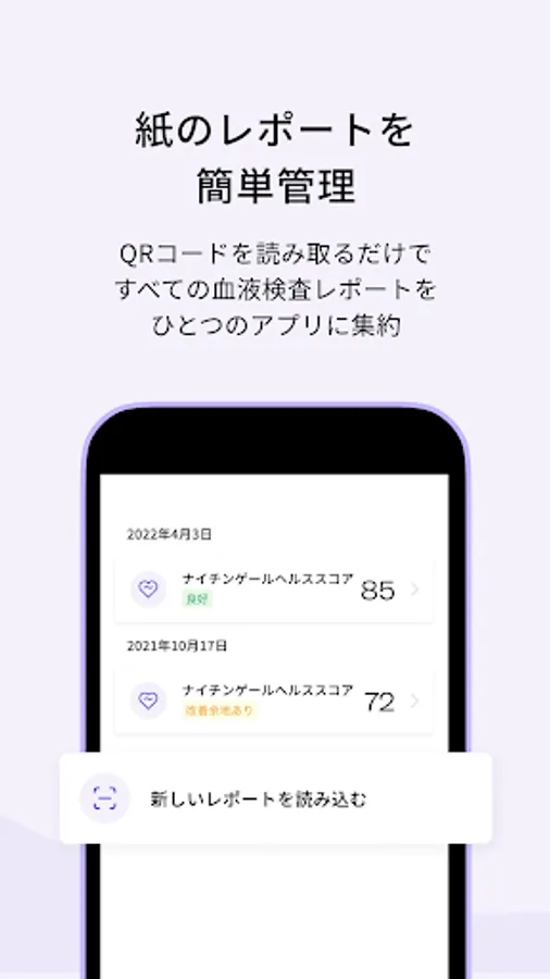 After taking a My Nightingale blood test at a partner medical institution, scan the QR code on your paper report and your test results will be added to the app.