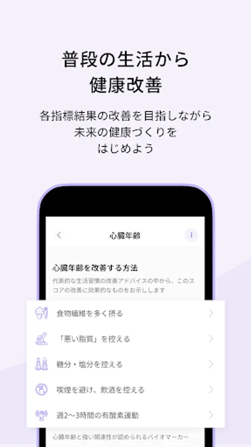Health Index evaluates your health from five different angles. Each health indicator is affected by different lifestyle habits; for example, consuming good fats can improve your fatty acid balance, and jogging can lower your heart age.