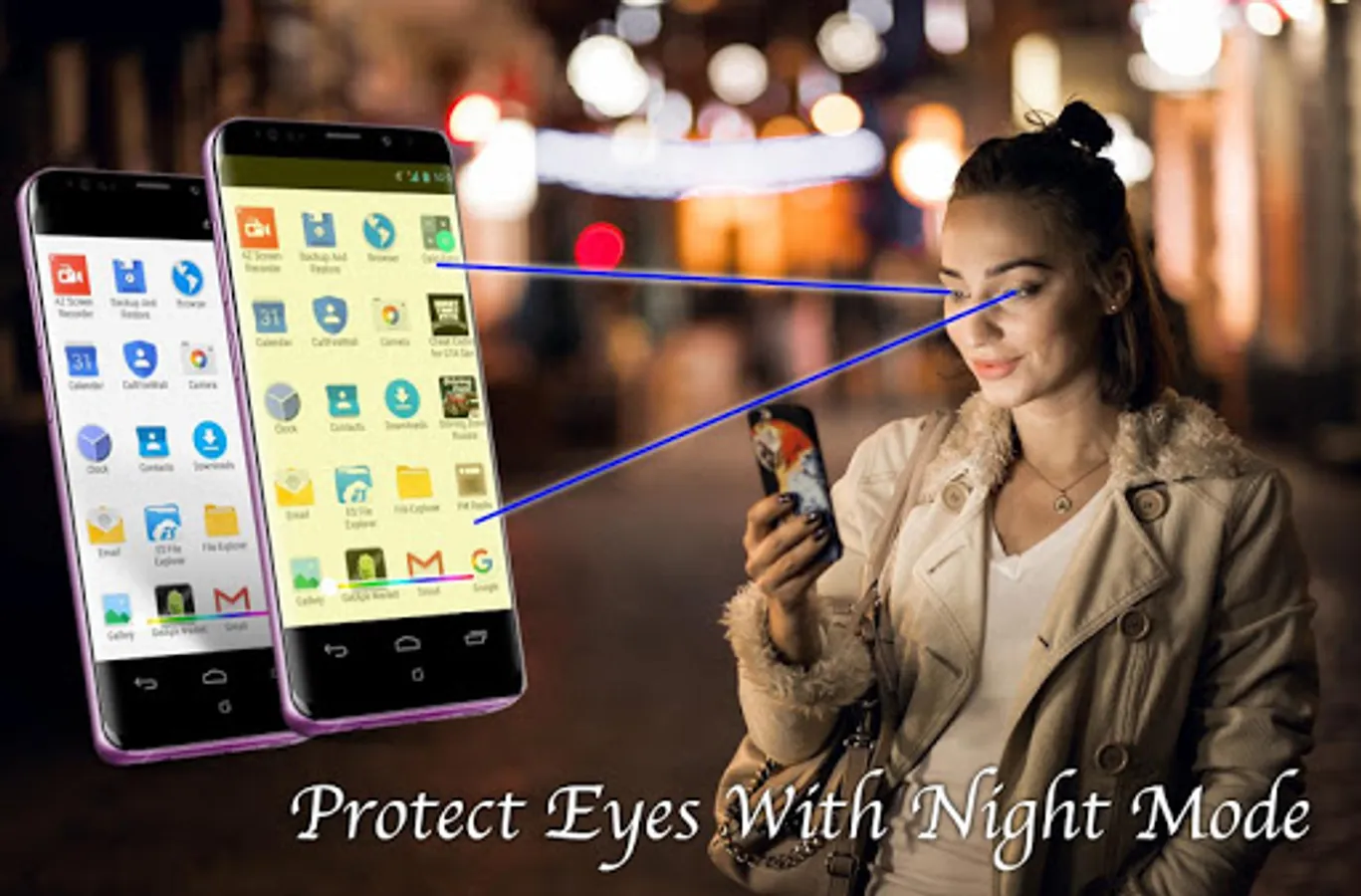 Night mode reading screen app in night shift low brightness. Auto night mode screen dimmer app for blue light control. Auto brightness low and high light. Auto screen brightness low and light filter. Low brightness for screen mobile. Use blue light filter and sleep better in night. Blue light filter eye care is very useful night screen app for everyone. Best eye care night mode screen dimmer app.