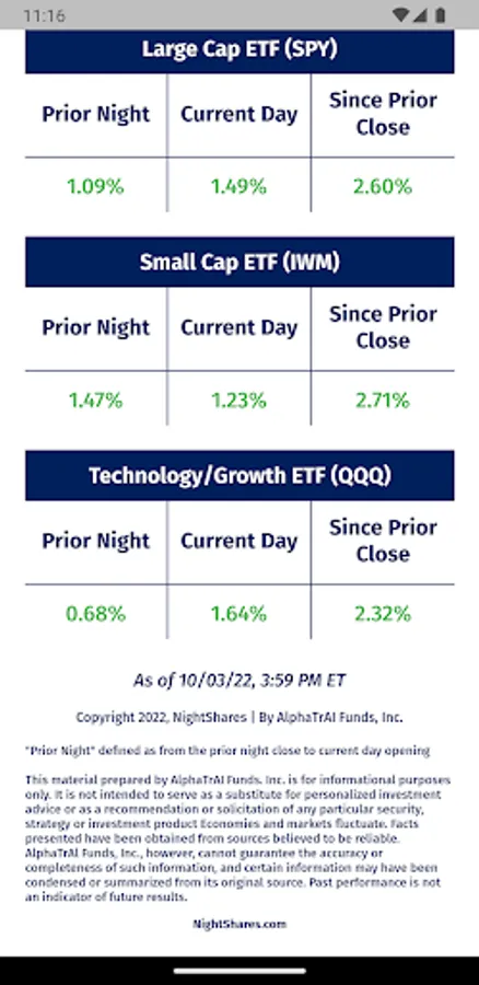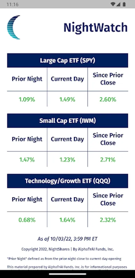 The NightWatch provides real time U.S. equity market performance during market hours (9:30 a.m. to 4:00 p.m. Eastern Time) split between the prior night’s and current day’s session.