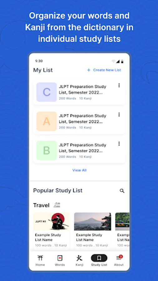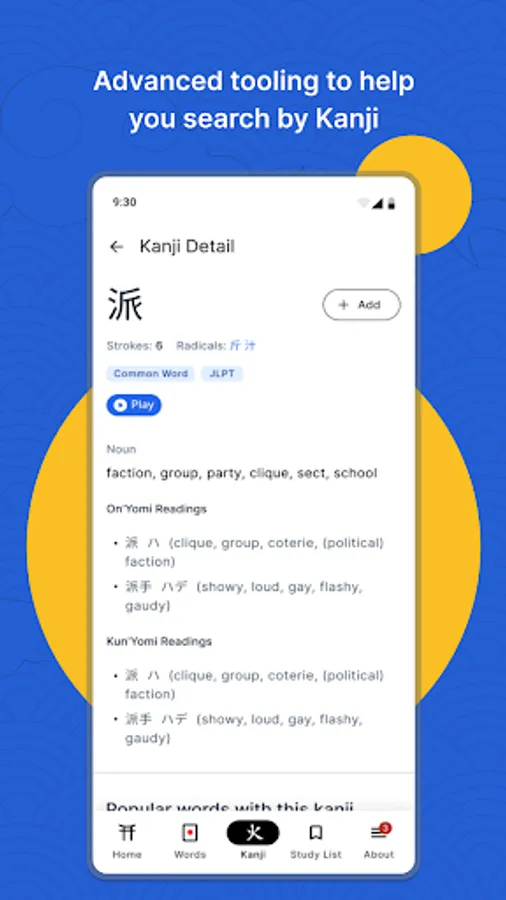 Use this Japanese dictionary to quickly find words and kanji. Example sentences, related kanji, JLPT levels and more. Create your own custom study lists to gather the words and kanji that matter to you. Use our flashcards to study and grow your vocabulary quickly. Use the popular study lists to learn words and kanji for common situations when traveling, shopping or working in Japan!
