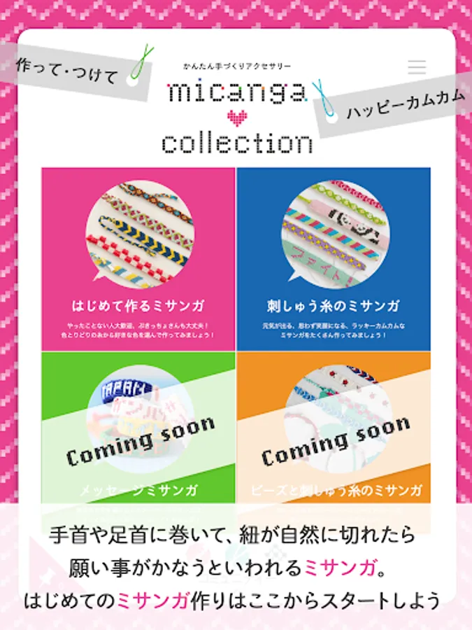 There are four misanga-making: "First Misanga", "Embroidery Thread Misanga", "Message Misanga", and "Beads and Embroidery Thread Misanga". For those who are making Misanga for the first time, let's start with "Making Misanga for the first time" and learn the essential tips for making Misanga, such as how to tie the embroidery thread, how to read the design, and how to add threads.