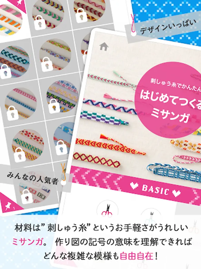 Once you've learned the basics, become familiar with handling embroidery threads, and understand how to tie them, you'll be able to create your own original Misanga by changing the color and design of the threads. "Embroidery Thread Misanga", "Message Misanga", and "Beads and Embroidery Thread Misanga" show how to make more advanced misanga such as letters, small flower patterns, heart patterns, and incorporating beads.