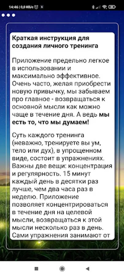 The application is extremely easy to use and as effective as possible. Very often, wanting to acquire a new habit, we forget about the main thing - to return to the main idea as often as possible during the day. But success lies in a simple formula: we are what we think!