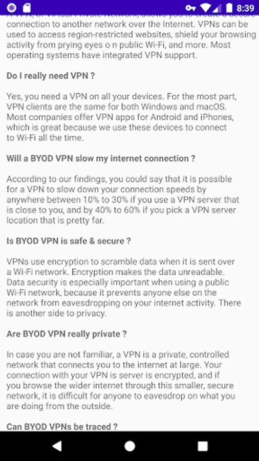 BYOD VPN is a VPN app that keep you safe while you surf the web. It take charge of your app and browser security and privacy when using public WiFi.