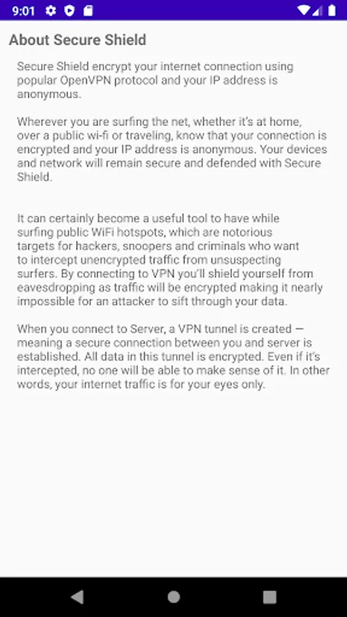 When you connect to Server, a VPN tunnel is created -- meaning a secure connection between you and server is established. All data in this tunnel is encrypted. Even if it’s intercepted, no one will be able to make sense of it. In other words, your internet traffic is for your eyes only.