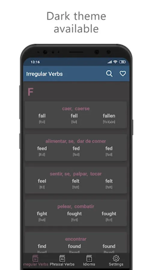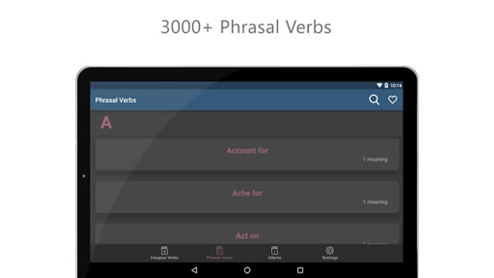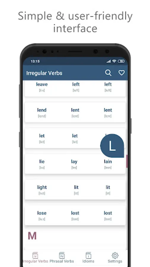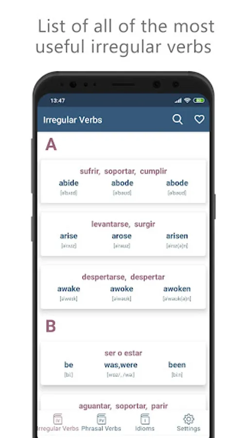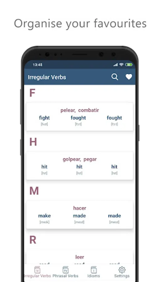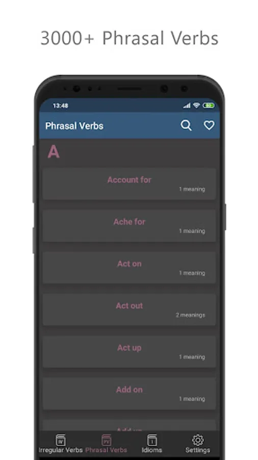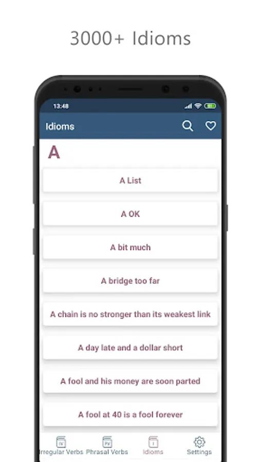The application focuses on three of the most challenging topics of the English language. The app is covered 3000+ Phrasal Verbs, 3000+ Idioms and a list of some of the most useful irregular verb forms.