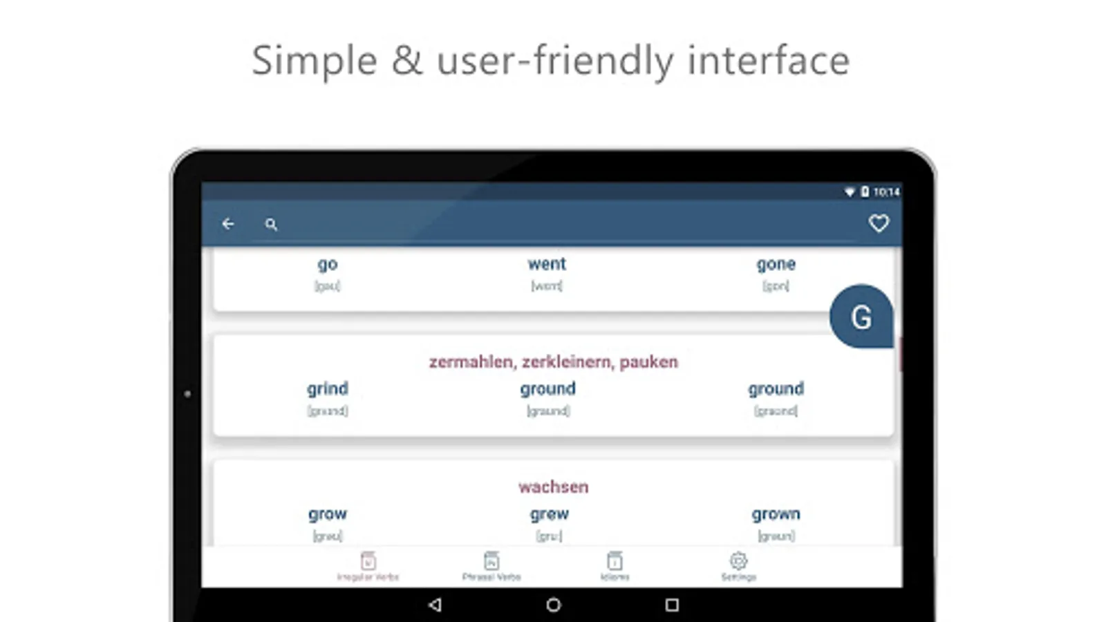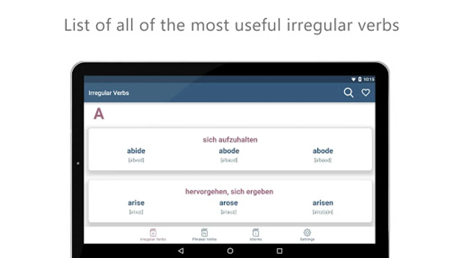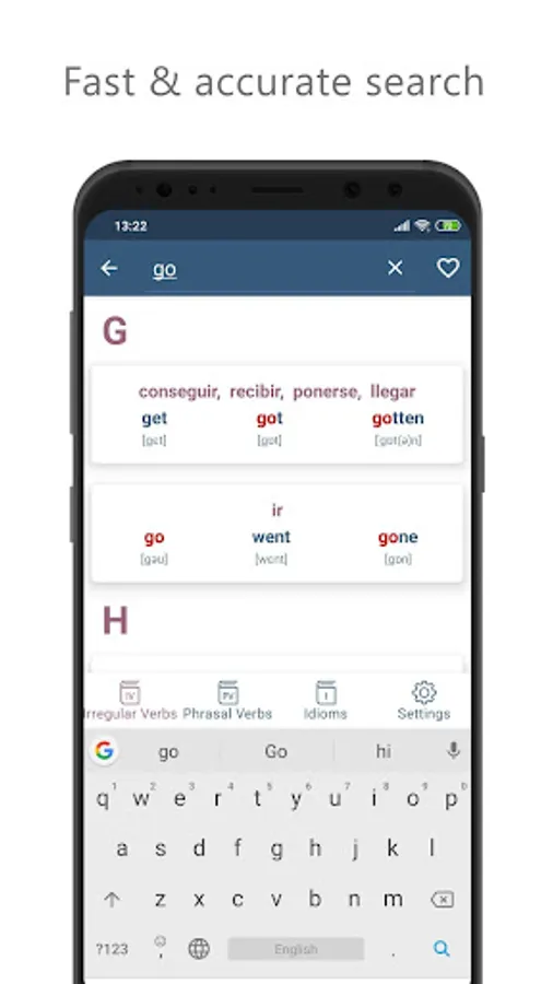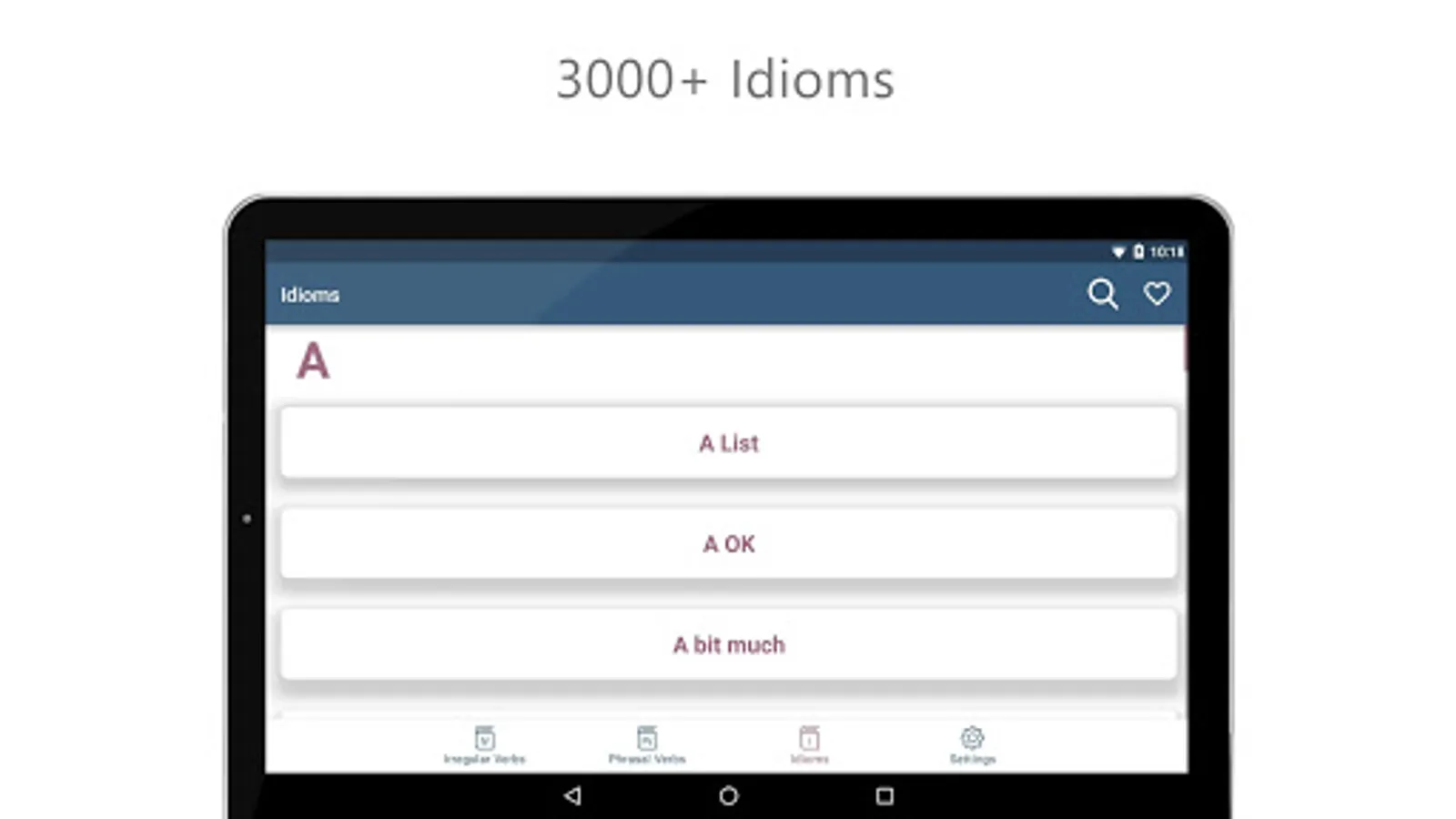 The application focuses on three of the most challenging topics of the English language. The app is covered 3000+ Phrasal Verbs, 3000+ Idioms and a list of some of the most useful irregular verb forms.