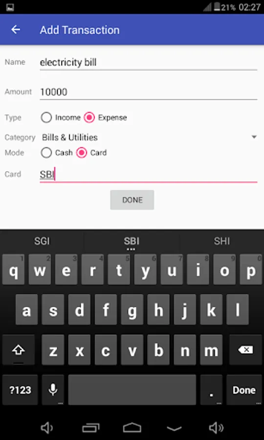 Wallet - Your pocket assistant is your personal database which keeps a track of all your financial data. You can easily put all your expenses and incomes details. It helps you to maintain multiple accounts. Analyze section will help to keep a watch on your expenses and income category wise. You can also add the type of transaction mode i.e. either cash or card so that at a later time if you forget how you made the payment, then you can check it using the application. You can also edit the transaction details if by mistake put it wrong.