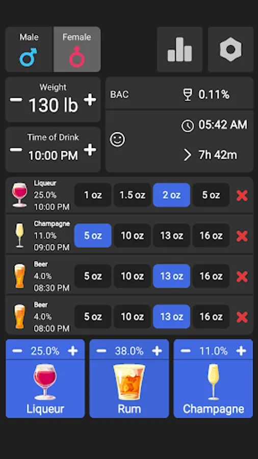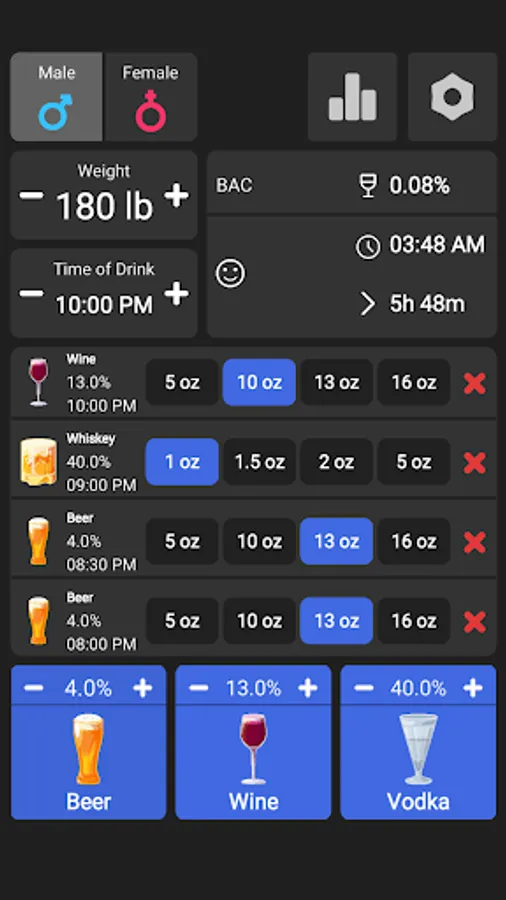 - Calculates your BAC based on your gender, weight, the type and amount of drinks you have consumed, and the time you started drinking.