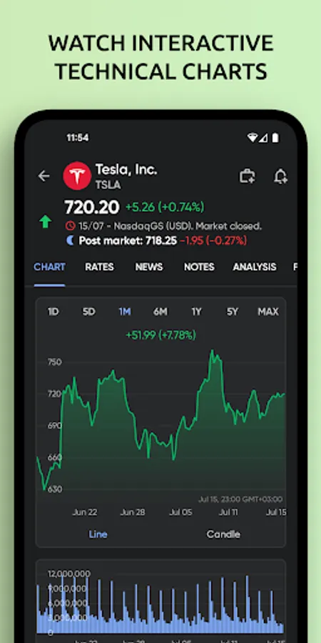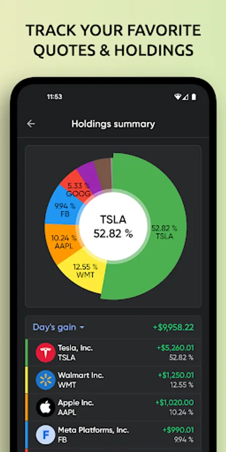 Use on-screen widgets to keep track of your stocks without opening the app. Various settings and colors of stock widgets help effectively monitor changes in stock prices in global markets.
