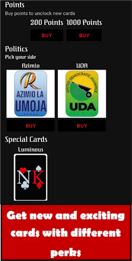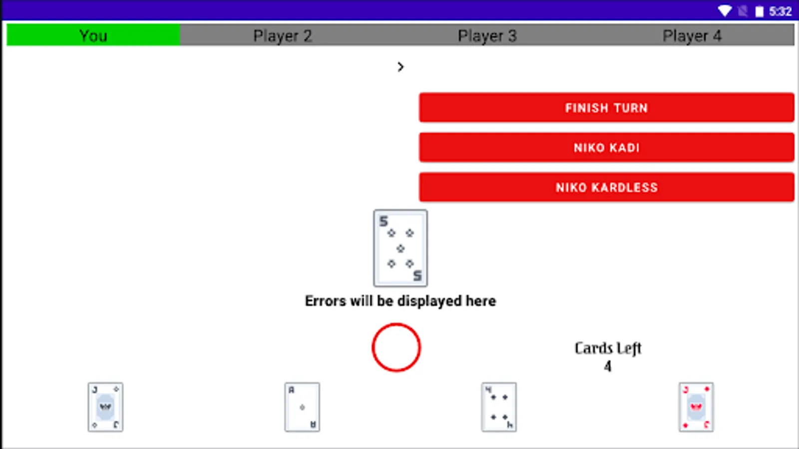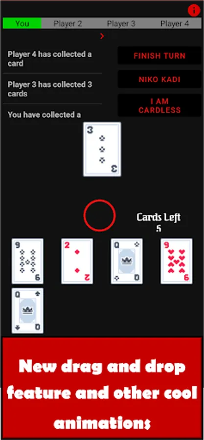 Play the popular Kenyan card game the way its meant to be played. Play against the AI that currently plays on easy difficulty with medium, hard and expert difficulties coming soon. Learn the various variations and the accepted way of playing the game. Gambling is NOT allowed in the game and it can ruin the game in real life. Earn points from playing that can be redeemed for better cards with good perks