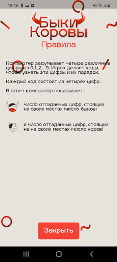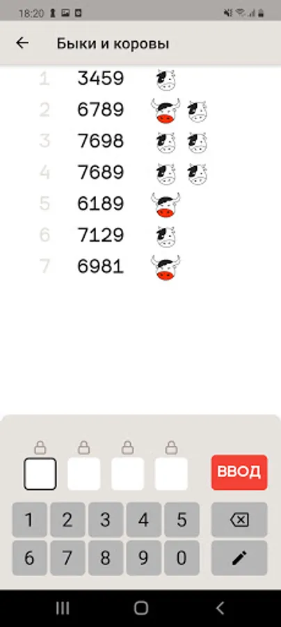 This is the famous board game: Bulls and Cows. Your task is to try to guess the four numbers conceived by the computer. After each move you will receive hints.