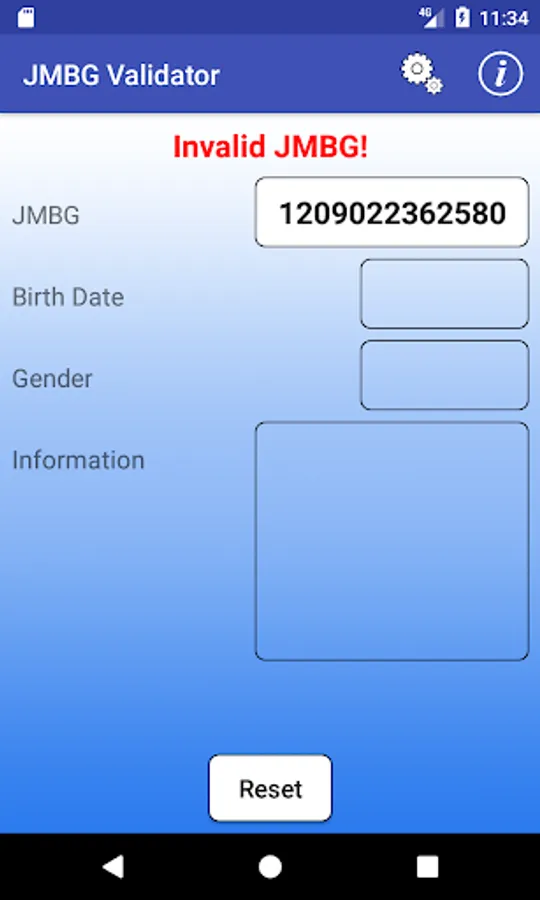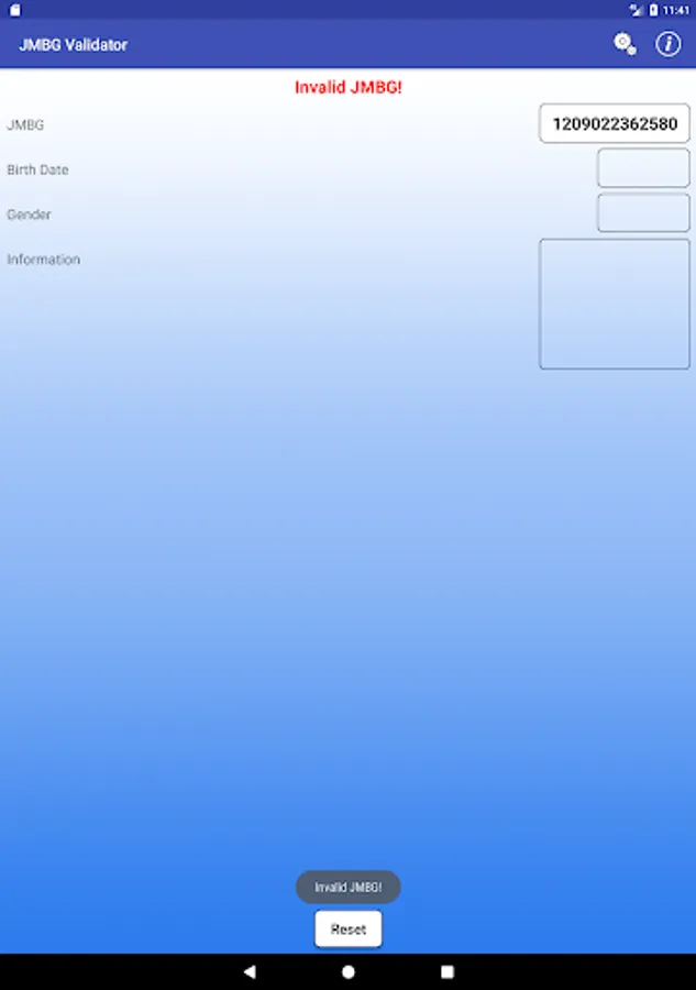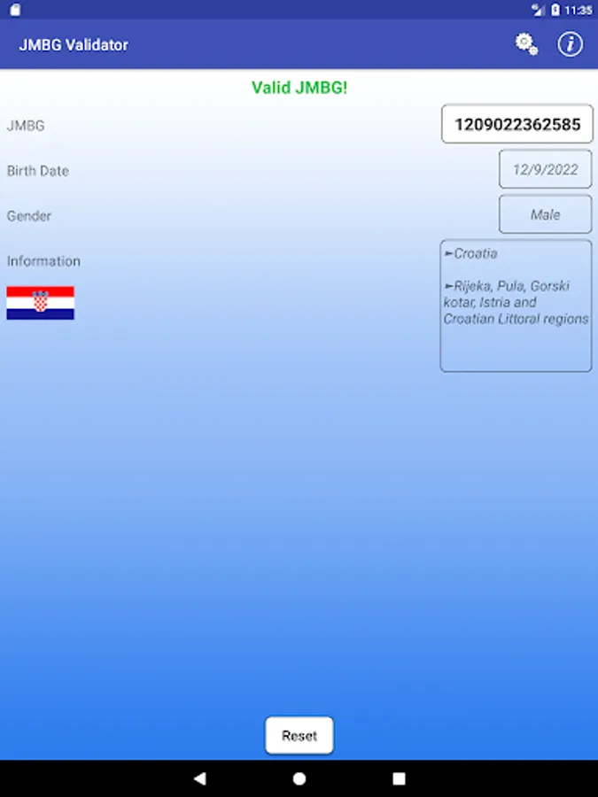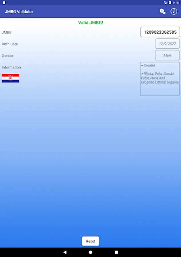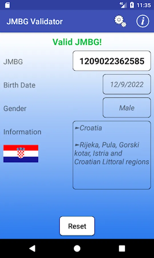 ► To validate a JMBG, just touch on the JMBG field, enter the JMBG number (13 digits) and the app will automatically let you know whether it's valid or not. Simple as that!