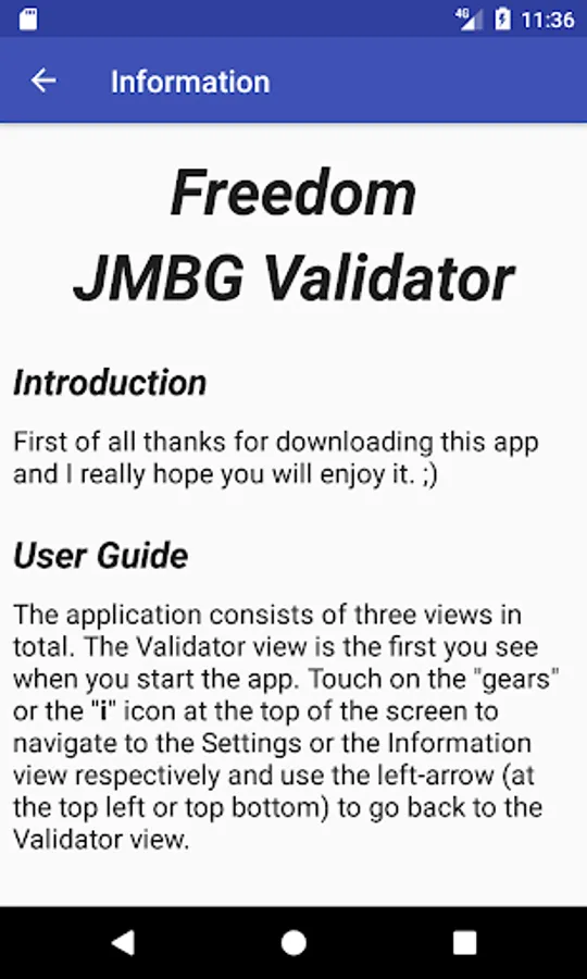 If you have any questions, suggestions, problems or feedback, don’t hesitate to contact me at FreedomJMBGValidator@gmail.com (please make sure “Freedom JMBG Validator (Android)” is included in the subject of the email, preferably at the beginning).