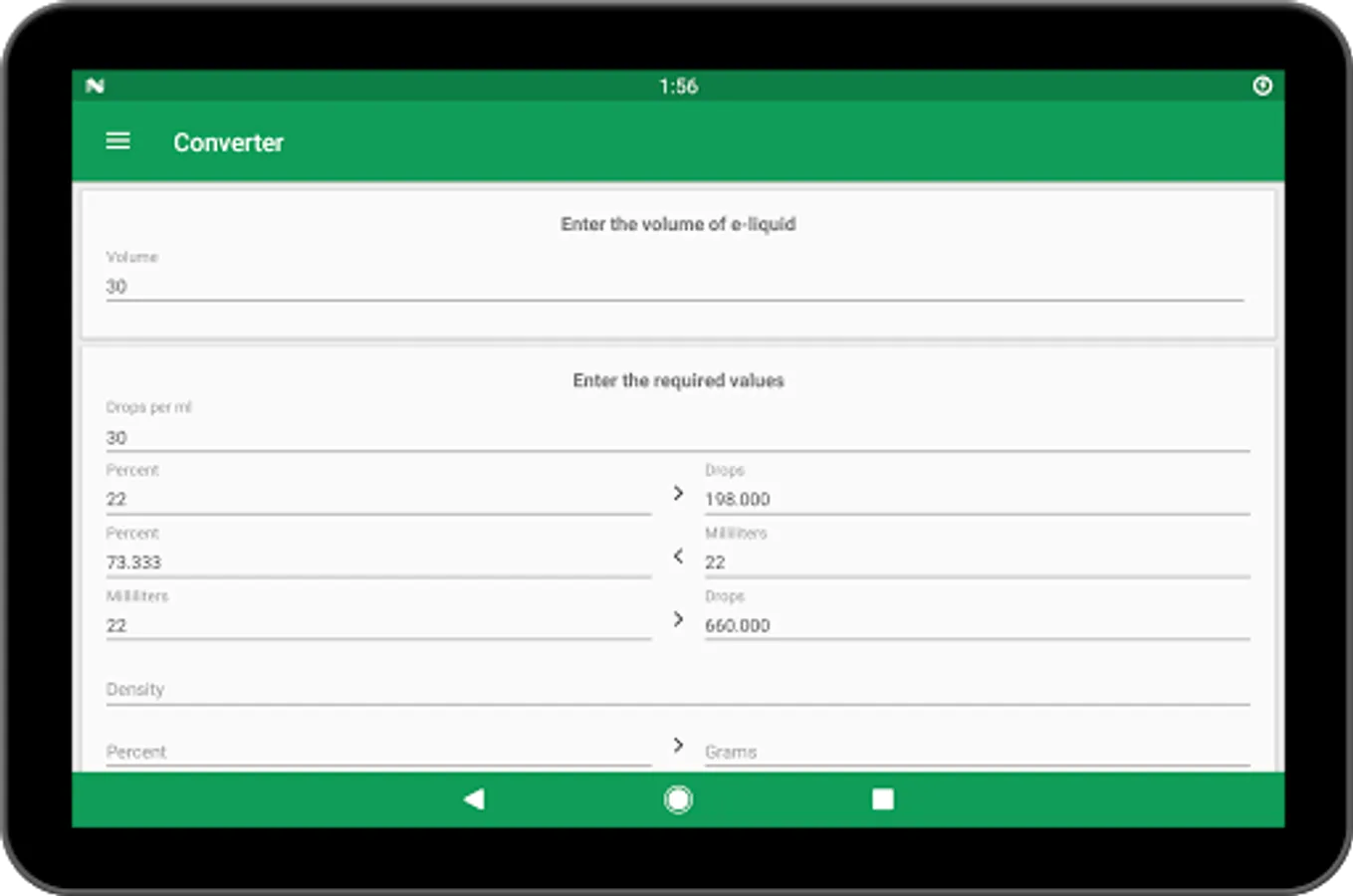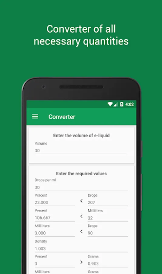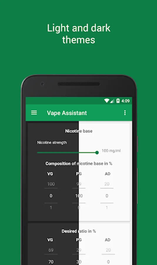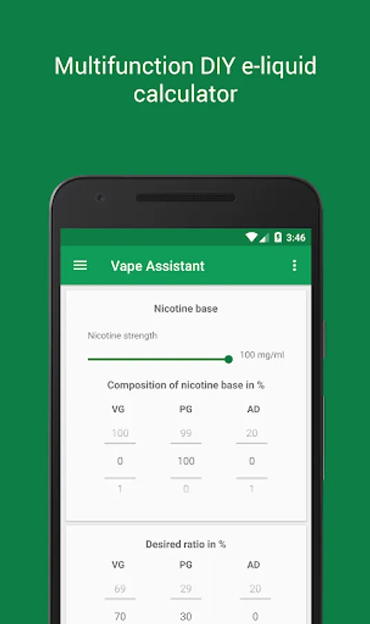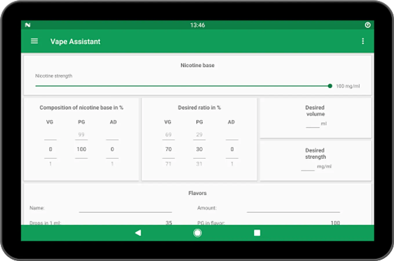 - "Expert mode" - the ability to set the density of VG, PG, AD, nicotine base and each flavor. And also increases the maximum strength of nicotine to 1000.;