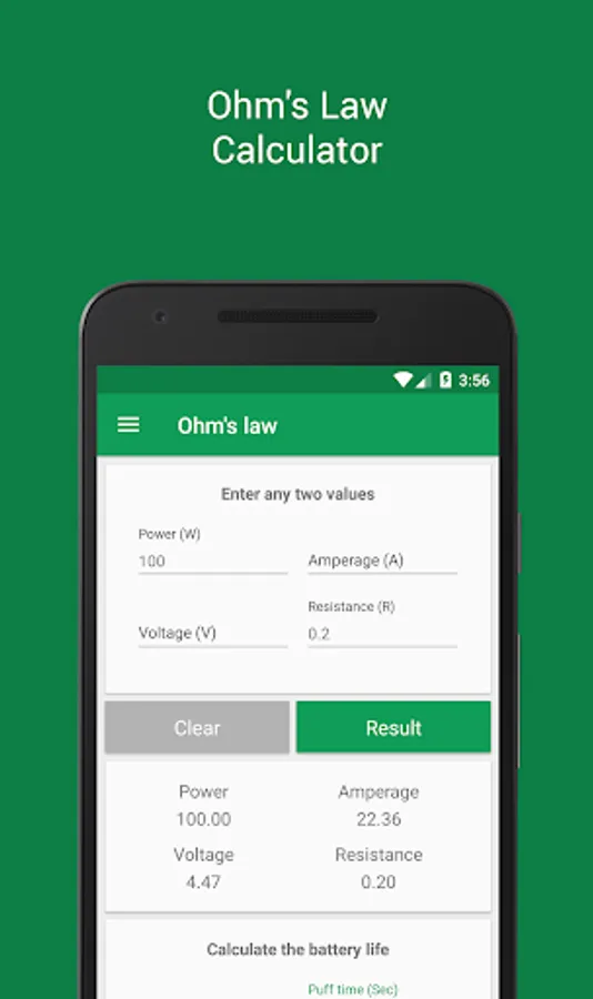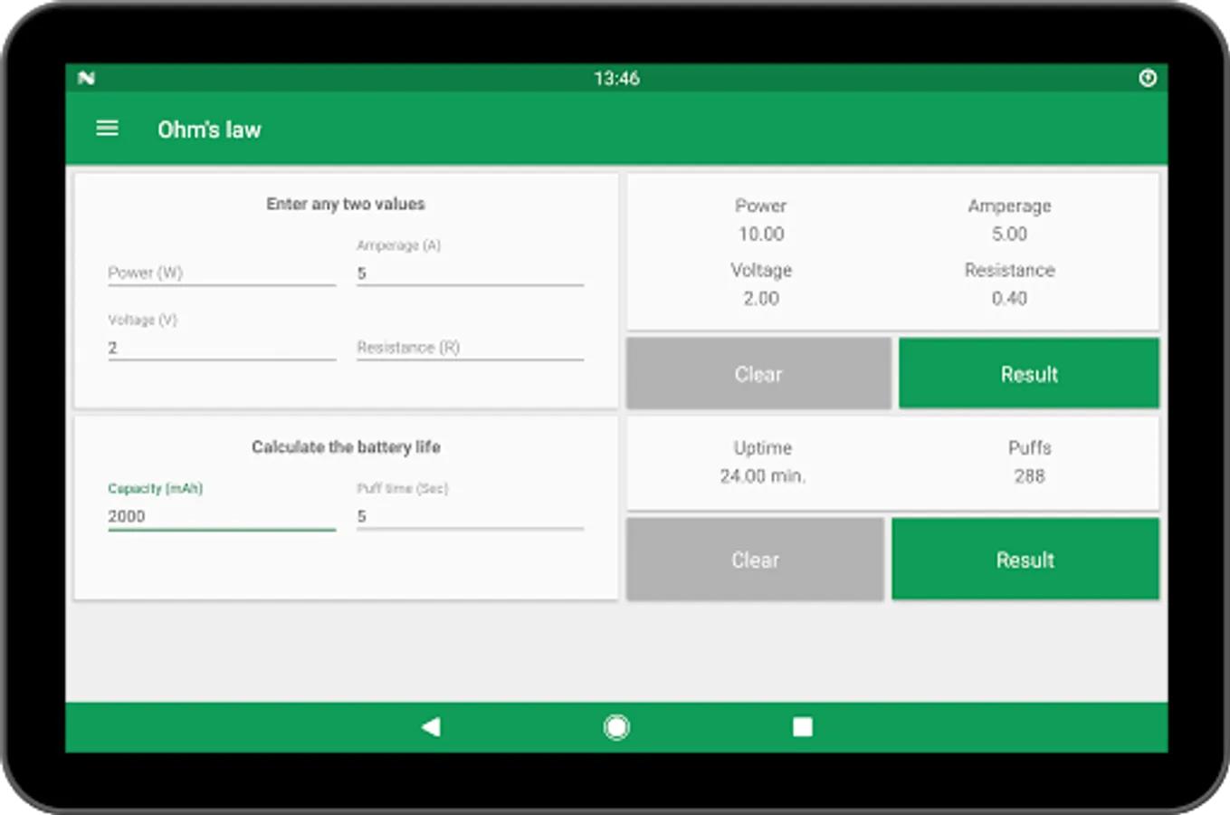 - Calculation of amperage, power, voltage and resistance in a couple of clicks.