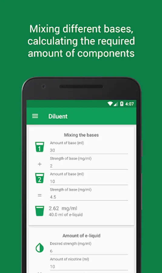 - Here you can mix different bases, find out the necessary amount of nicotine, e-liquid, etc.