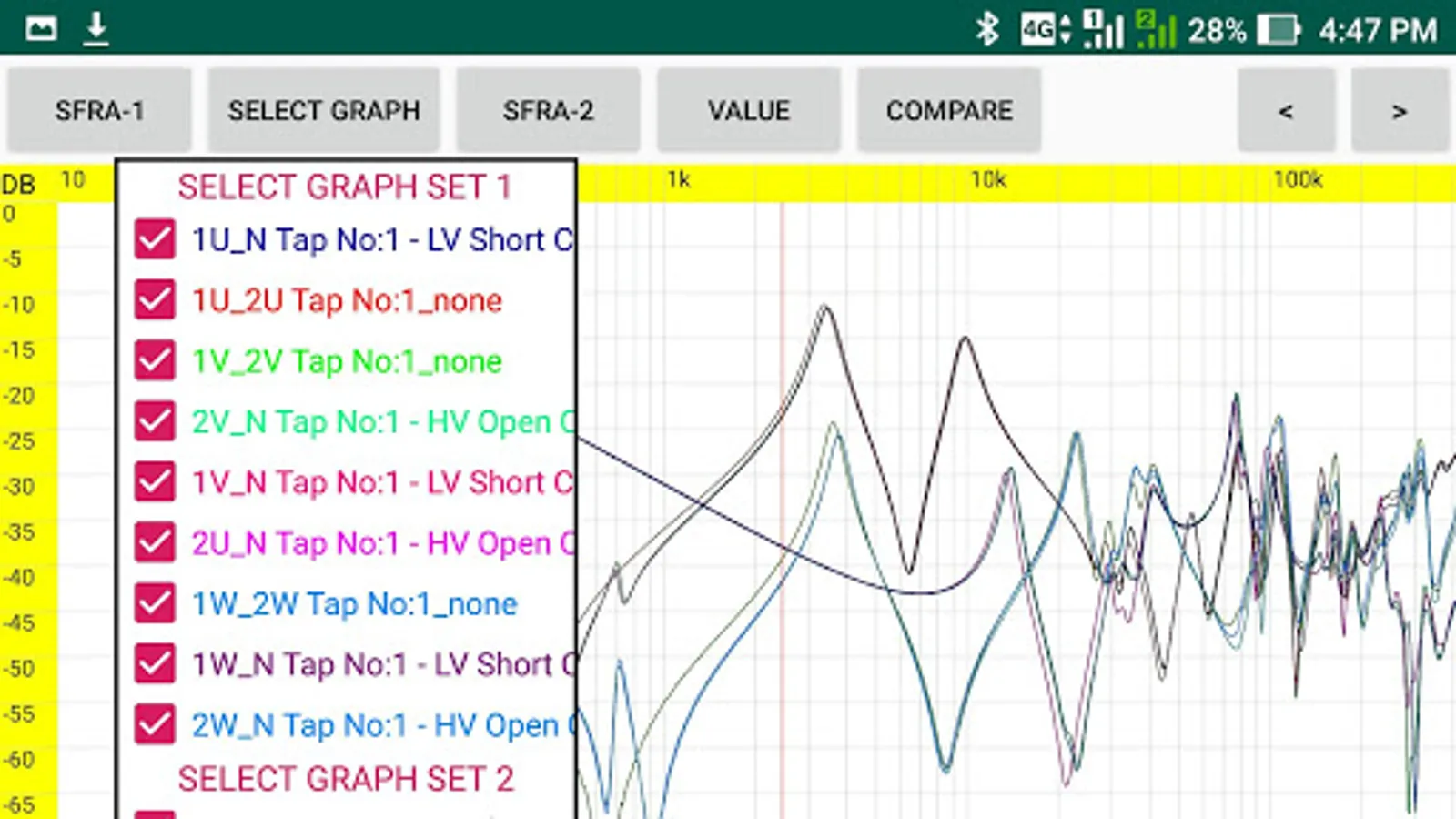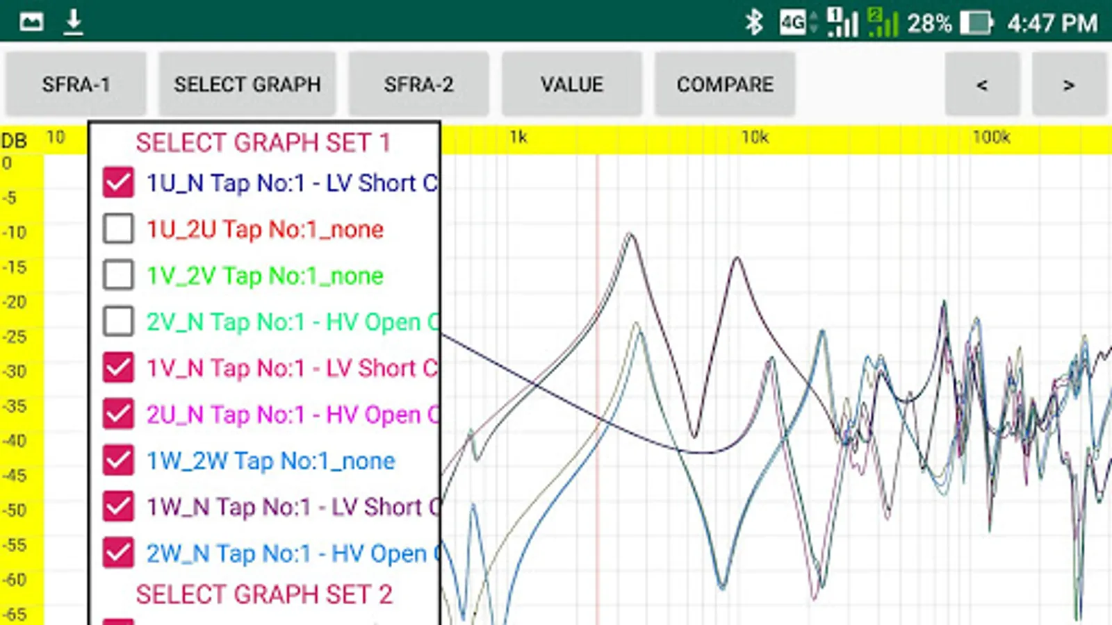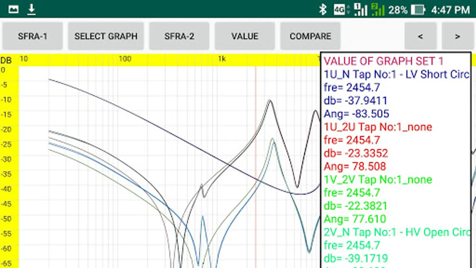 Sweep frequency response analysis (SFRA) is a method to evaluate the mechanical integrity of core, windings and clamping structures within power transformers by measuring their electrical transfer functions over a wide frequency range. Using this app, .sfra or .frax file is analyzed. At different points of frequency, dB value and ang value can be compared with different graphs.