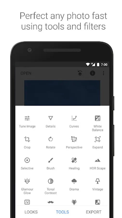 • 29 Tools and Filters, including: Healing, Brush, Structure, HDR, Perspective (see list below)