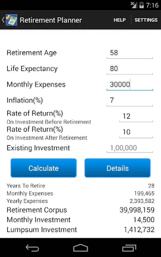 So Number of Years left for your retirement are 28 years and at retirement you will require a retirement corpus of 3,99,98,159 for which I need to save 7,719 per month.
