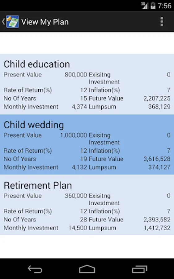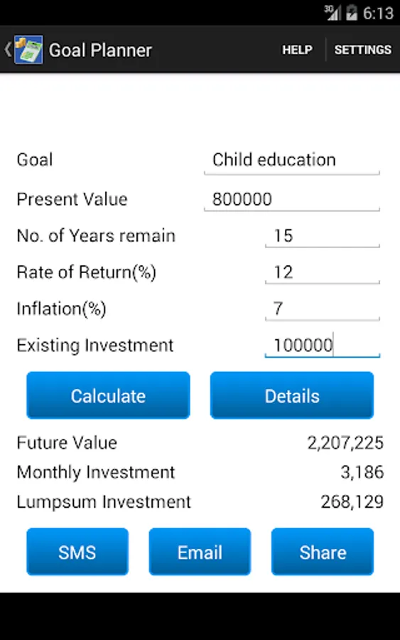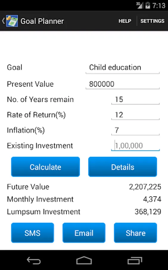 Example: Suppose you want to plan for your Child education which costs 8, 00,000 today. The Number of Years remain is 15 years and the inflation you expect is 7% and you expect 12% return from your investments. In that case future value is 22, 07,225 and to achieve that future value you need to invest 4,418 per month or lump sum invest 4, 03,252.