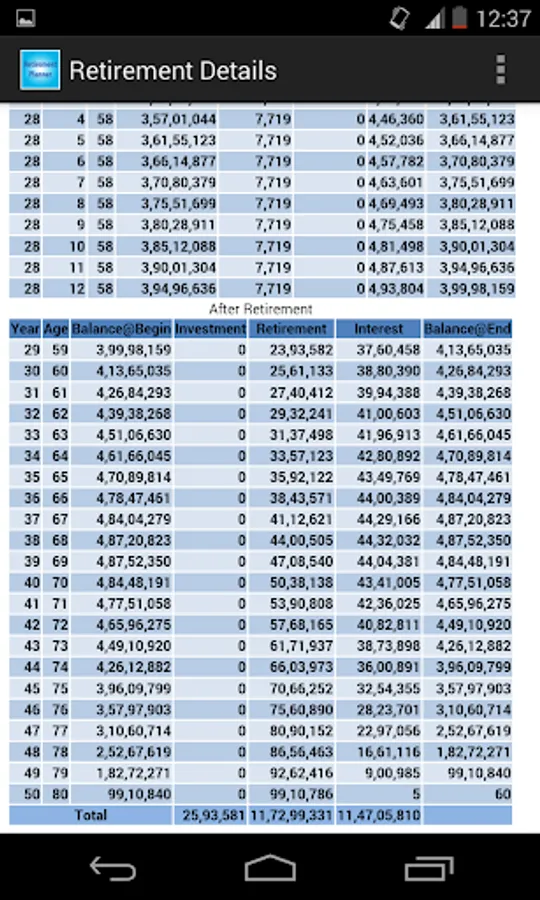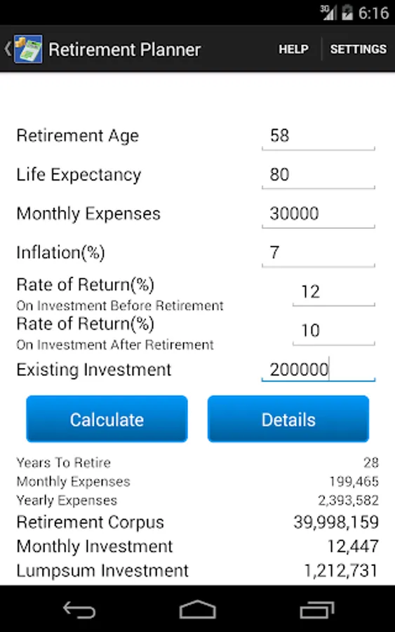 Retirement Planner helps you determine how much money you will need for your retirement to maintain the current lifestyle post retirement. You can give the Current Age, Retirement Age, Current Monthly Expenses, Expected Inflation, rate of returns on your investments before retirement and rate of returns on your investments after retirement.