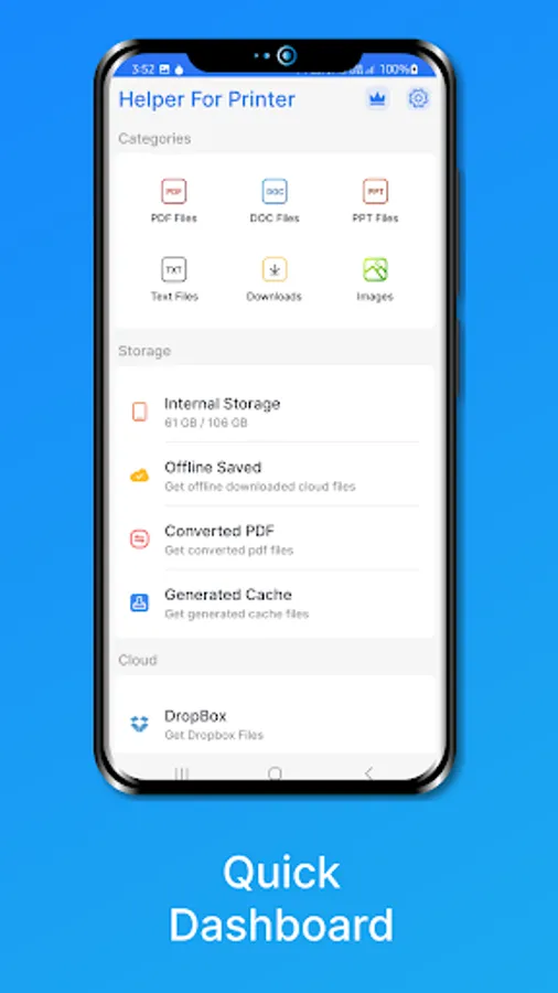 3. Cloud: It includes DropBox and Google Drive. We have implemented SDK for both cloud storage so you can access all files and folders of your DropBox and Google Drive accounts. You can download file from DropBox or Google Drive. And it will automatically transfer to the Offline Saved category. Where you can access downloaded file later to print or view.