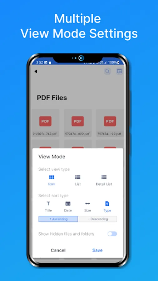 Three types of view mode such as Icon, List and Detail List. Four types of sort types such as Title, Date, Size and Type. Also option for Show hidden files and folders or not.
