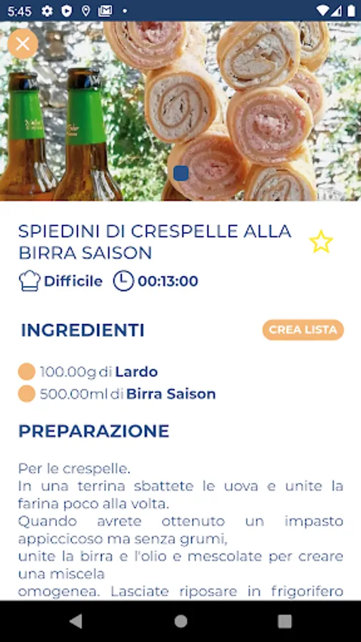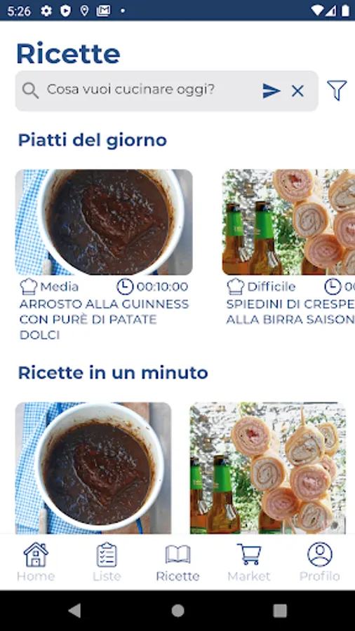 In the recipes section it will be possible to view many typical dishes of Italian cuisine. The recipes, as well as by name, can also be filtered by level of difficulty and preparation times so that you can always find the most suitable one for every situation. The app will propose a daily recipe of the day and, if set, you will receive notification. In detail of the recipe you will find all the instructions for its preparation and the ingredients themselves can be added to one of the shopping lists you previously created. In addition, each recipe can be selected as a favorite so that you can make a list of your most popular dishes.