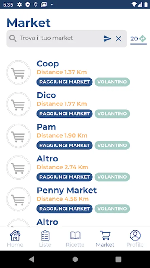 The market section lists the points of sale closest to you, on which you can search by sign and by distance. For each market in the list you can have the directions to reach it and, if present, view the flyer of the current offers.