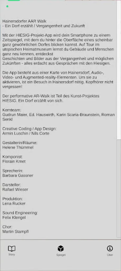The performative AR walk is part of the HIESIG art project. A village tells about itself. You can find the other parts of the project and more information at https://hiesig-memopark.net/