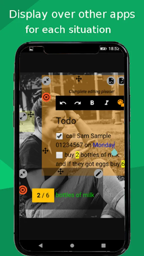 This app allows you to truly multitask with your phone - keep your notes for completing complex tasks in games, business applications or just as a reminder.