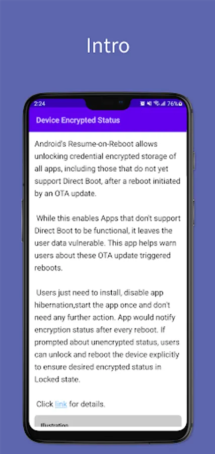 Users just need to install the app and don't need any further action. App would notify encryption status after every reboot. If prompted about unencrypted status, users can unlock and reboot the device explicitly to ensure desired encrypted status in Locked state.