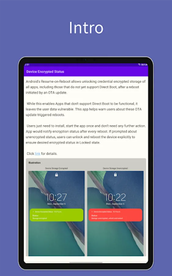While this enables Apps that don't support Direct Boot to be functional, it leaves the user data vulnerable. This app helps warn users about these OTA update triggered reboots.