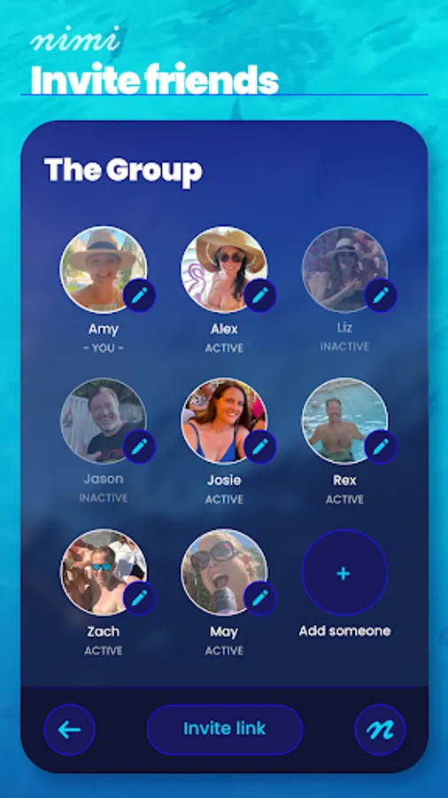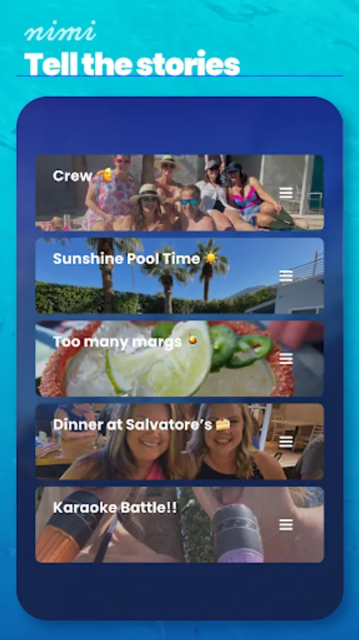 Memories: Start a trip. Invite other travelers. Using nimi lets everyone add photos, and create sharable memories that capture the fun forever. Stories on nimi are shared across all devices on the journey. A common photo pool means no need to text everyone's pictures when you take them.