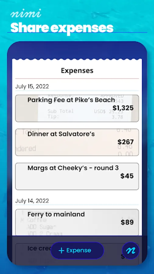 Expenses: The real currency of travel is the priceless memories it creates. That said, nimi tracks expenses to make sure money isn't the focus. Any time anyone pays for anything, just add the expense to nimi. Track the amount, tag who was there, and forget about it.