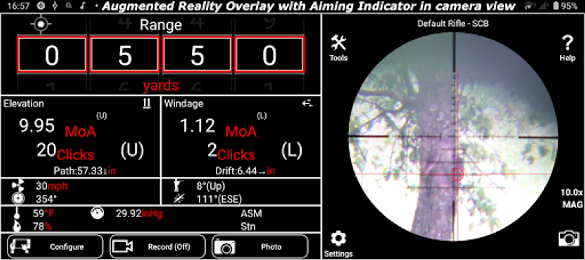 Wind Speed and Direction can be obtained automatically from a Bluetooth Weather meter (currently Kestrel 5500 series supported). When Wind Speed/Direction is being obtained from a weather meter, the wind direction from the weather meter is cross-coordinated with the shooting direction from the device sensor to give the precise wind direction relative to the shooter – critical for accurate ballistics windage calculation. (Most of the current digital smart scopes on the market cannot do this!).