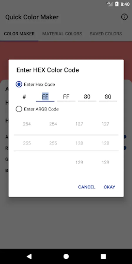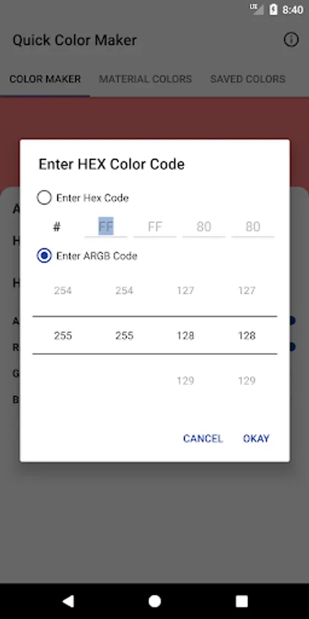 2. Find codes of color shades in RGB, ARGB and HEX color code formats.