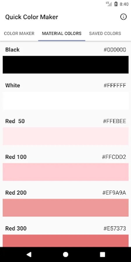 3. Explore comprehensive pallete of Material colors and find their RGB and HEXadecimal color codes.