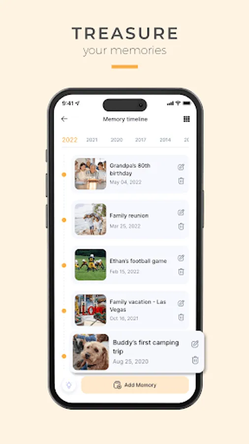 • Add your favorite photos to create an organized timeline of your family’s memories