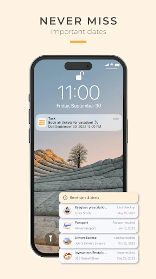 • Get event, task and expiring document reminders (for driver’s license, passport, etc.)