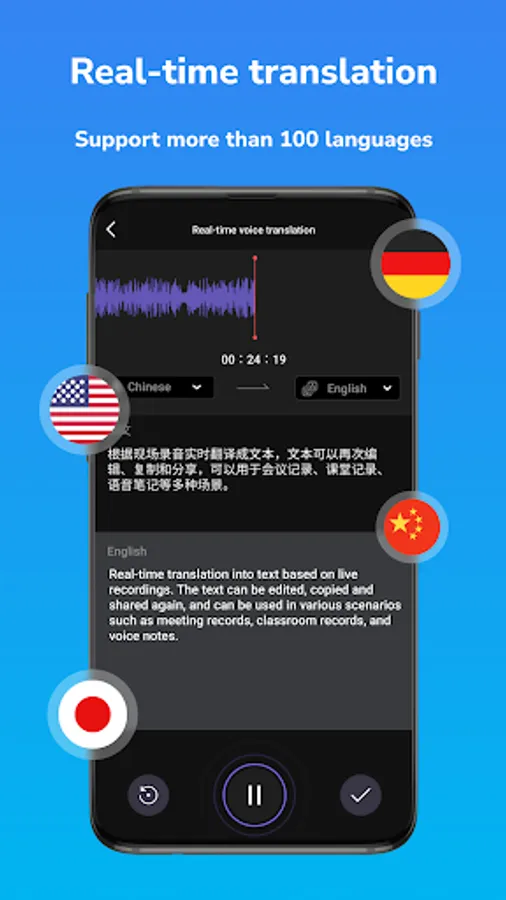 Support more than 100 language translations to meet the needs of conferences, training, teaching, travel and other scenarios. Supports text translation, photo translation, real-time voice translation, and online translation. AI speech translation adopts the industry's most advanced neural network translation engine technology, which has higher translation accuracy and faster speed than traditional machine translation.