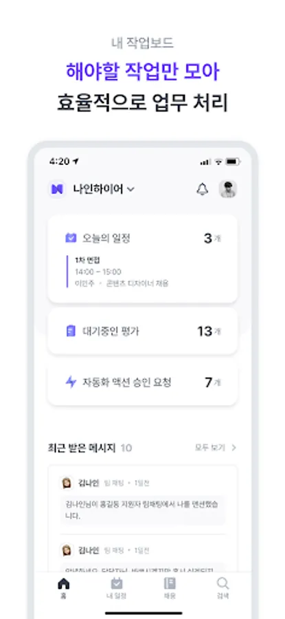 ・ [대기 중인 평가], [예정된 일정], [최근 받은 메시지]를 한 화면에서 확인하고 바로 작업을 시작할 수 있어요.