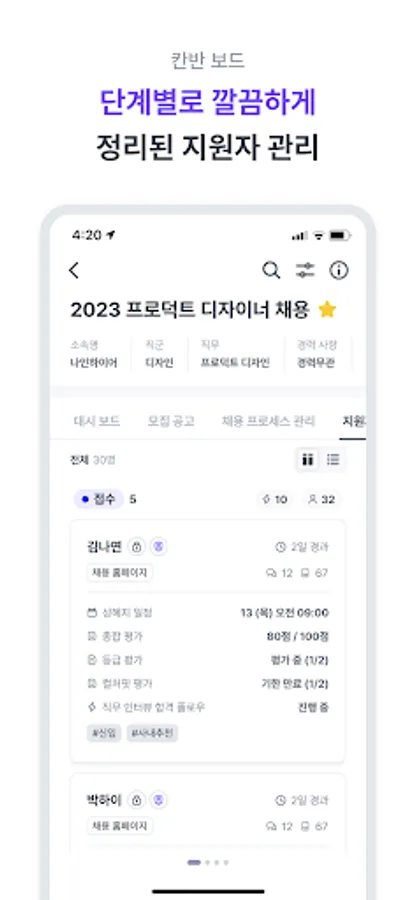 ・ 칸반 보드를 통해 단계별로 지원자가 깔끔하게 정리되어 있어요.