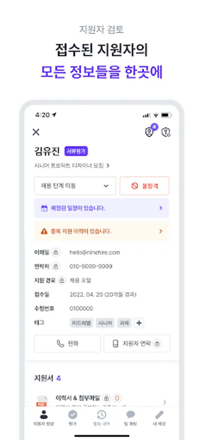 ・ 이력서를 포함한 접수된 지원자의 모든 정보를 열람할 수 있어요.