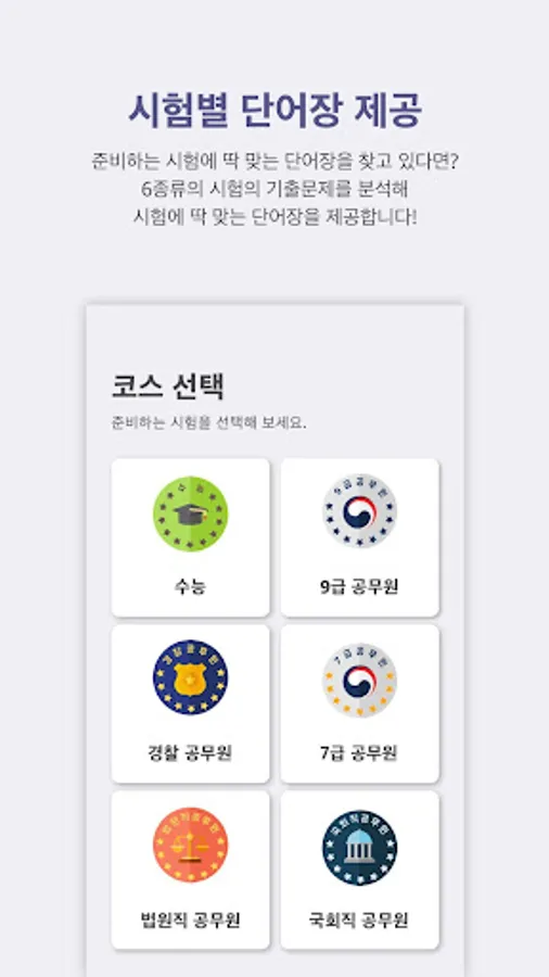 List of currently provided vocabulary words: SAT English, 9th grade officials (national, local, and Seoul), 7th grade officials (national, local, and Seoul), police officers, court officials, and parliamentary officials