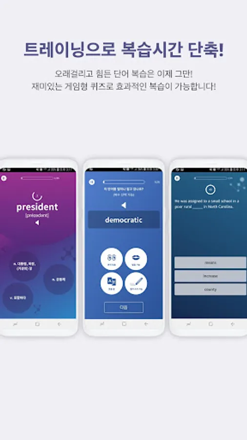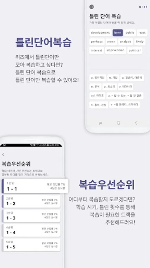 Wordcast analyzes the user's vocabulary level through user vocabulary test and recommends optimized learning content and learning volume. In addition, if you solve the quiz provided by the app, it analyzes the results, displays the wrong words, and provides automatic review.