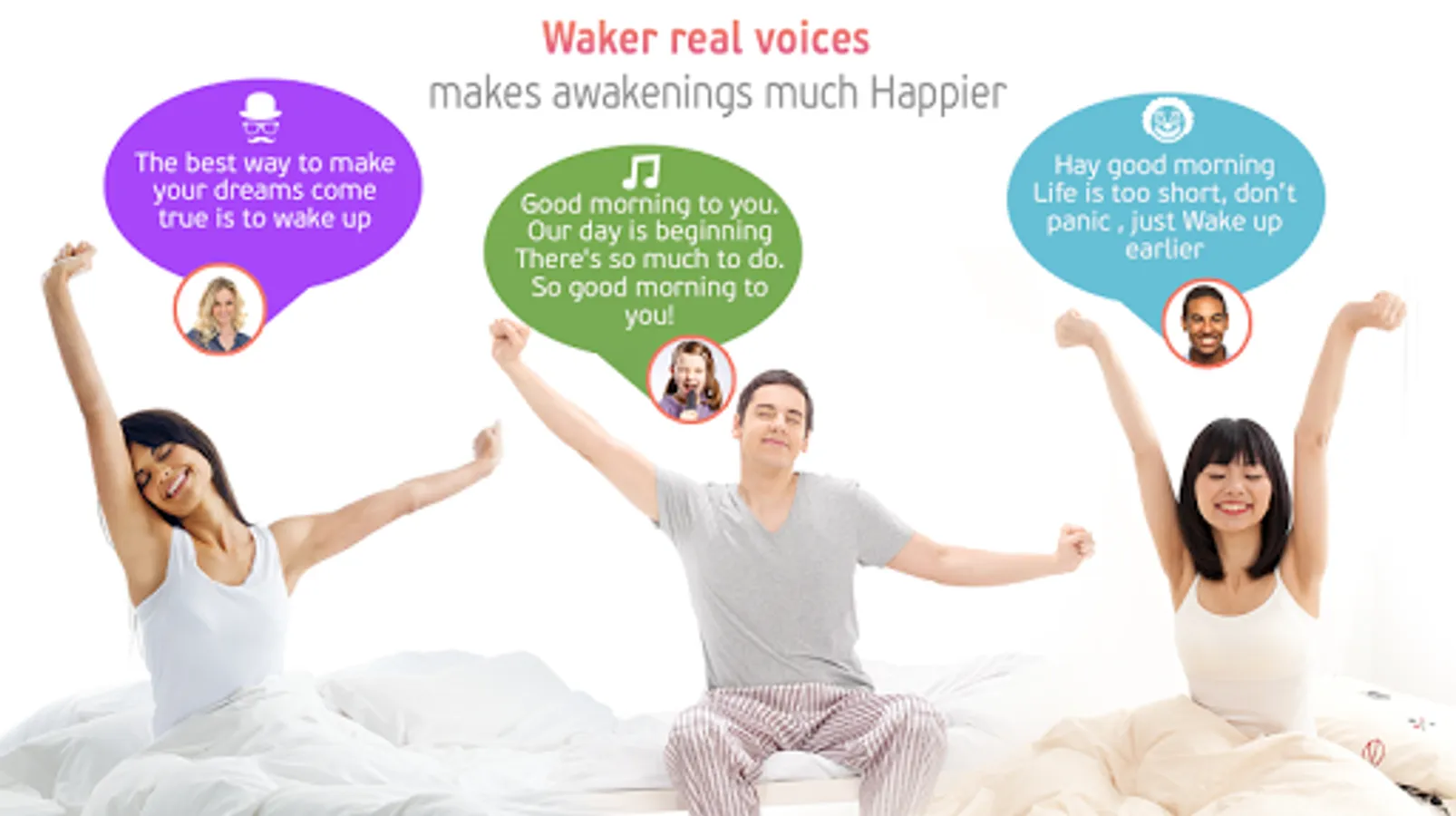 Waker is the first of its kind best wake up alarm app that wakes you each morning with recordings from real people. Now you can calmly and gently wake up with voices from real men, women, and children. Set the alarm according to your own preferences of different voices with soothing background musics.